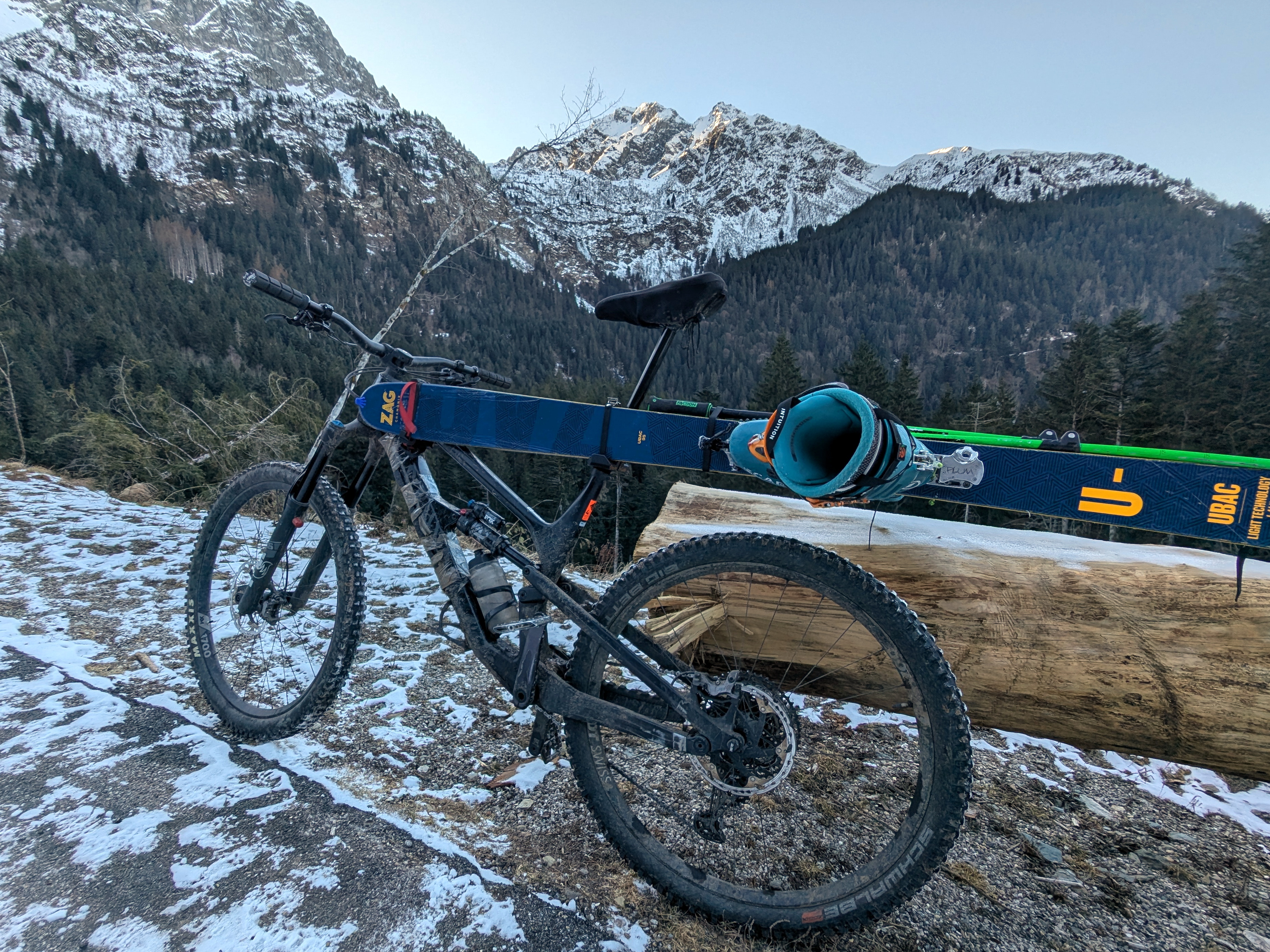 Every skier who has tried the combination of cycling and skiing knows: the struggle begins as soon as you have to attach skis and poles to the bike. After 15 minutes of battling in the cold with gloves on, you finally start… and everything ends up on the ground at the first pothole.